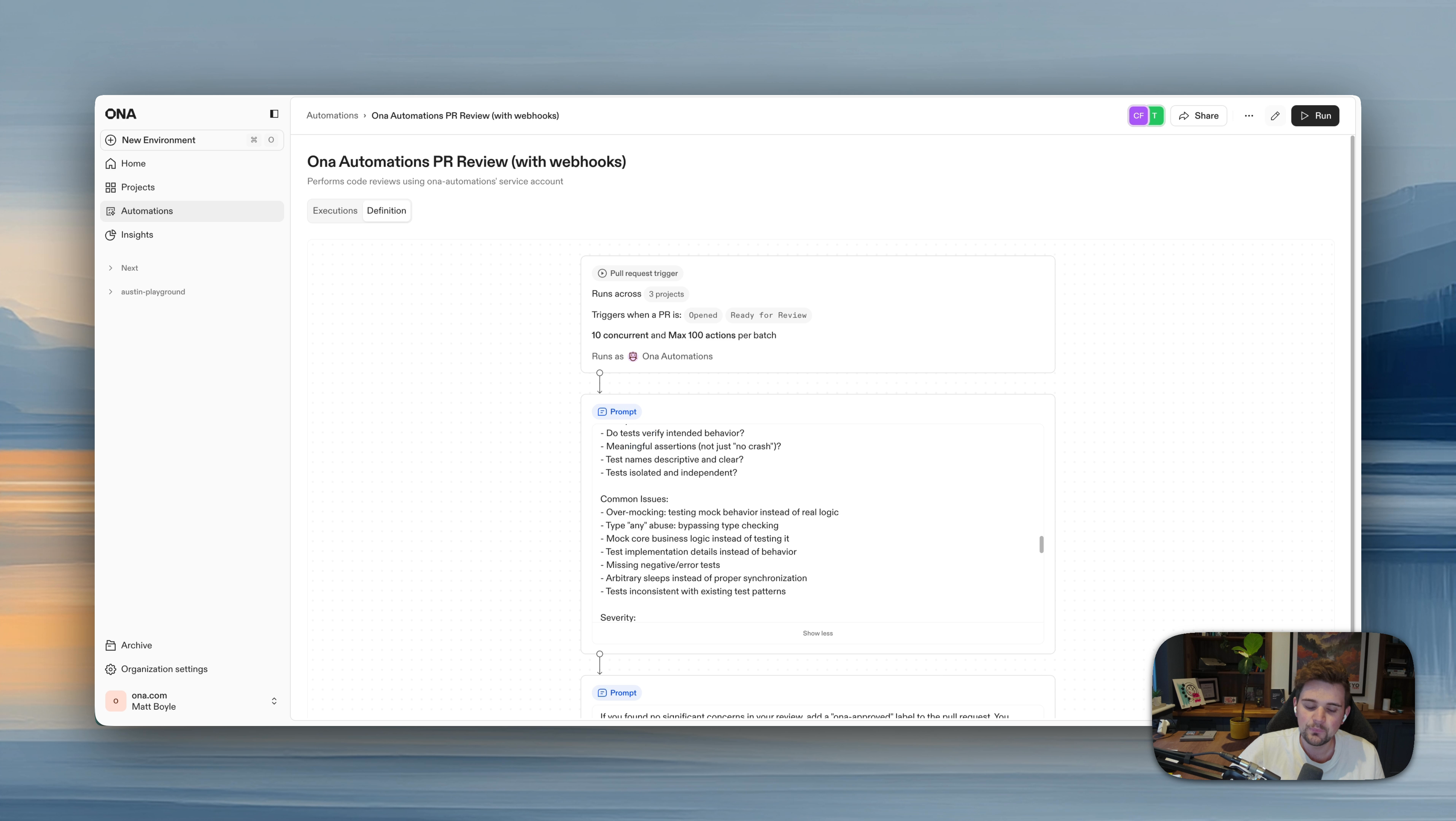 Triggered on every PR. Ona compiles, runs tests, catches issues, and iterates on fixes — before your team starts reviewing.