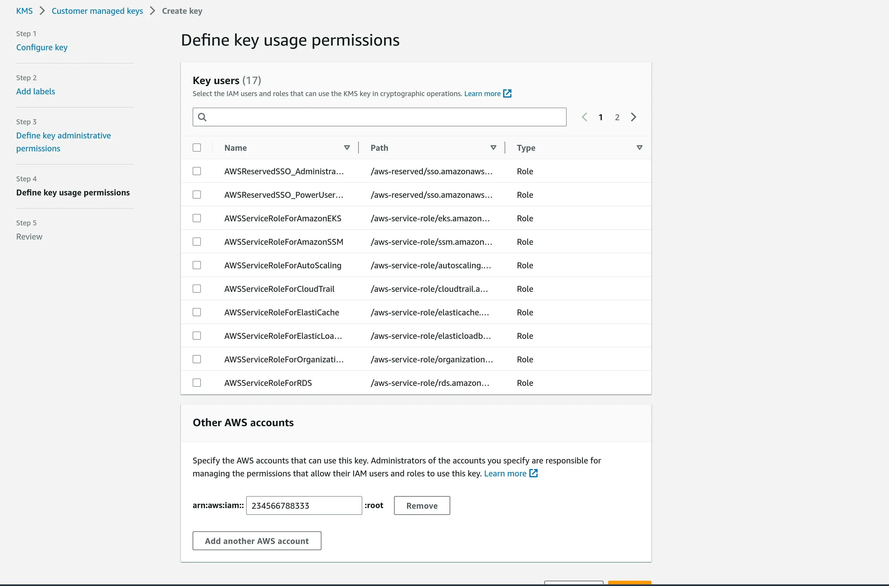 aws/secretmanagerkey. This is very important because secrets signed with the default key cannot be shared with other accounts. When creating the key, allow access to the Gitpod instance’s AWS account to the key by providing the account ID as can be seen in the image:
