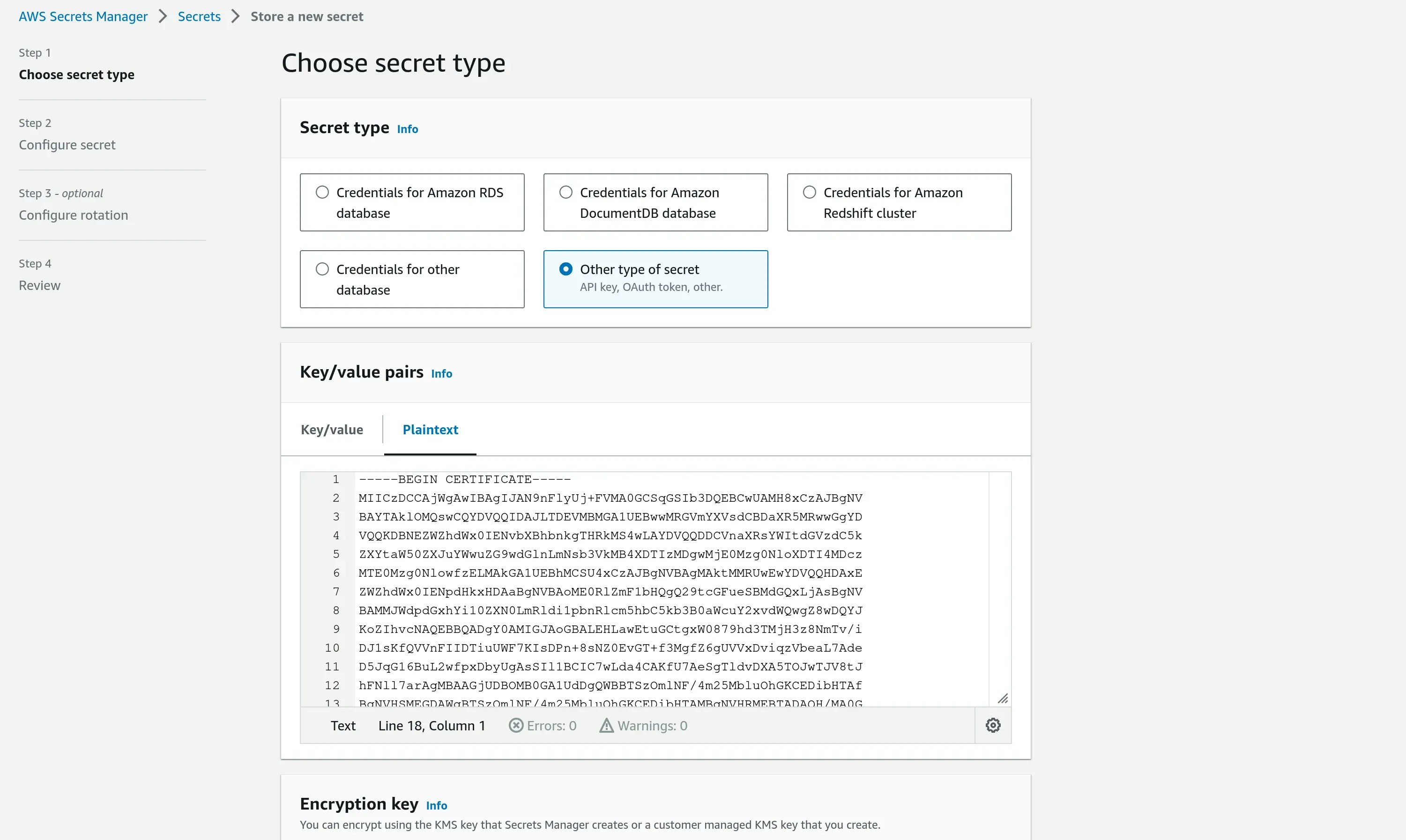 In the preferred AWS account, navigate to the Secret Manager within the AWS Console. Click on Store a new secret. Select the Secret Type as Other and input your certificate in plain text as illustrated below
