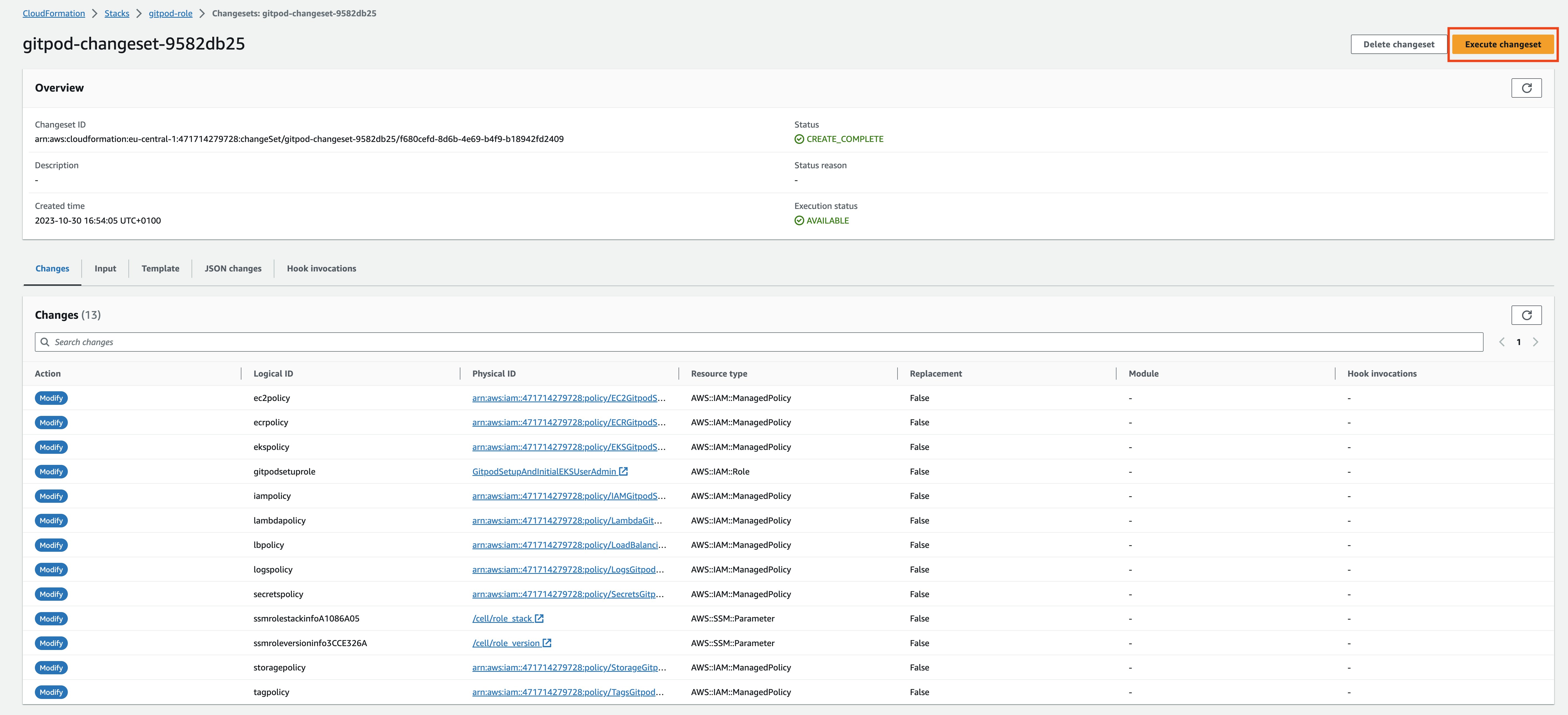 - The existing Gitpod CloudFormation stacks are updated via automatically generated changesets. Your Gitpod Account Manager will share these in the form of deeplinks to these changesets that then need to be executed (i.e. accepted) by the user. Note that you may receive either one or two deeplinks depending on the updates required.