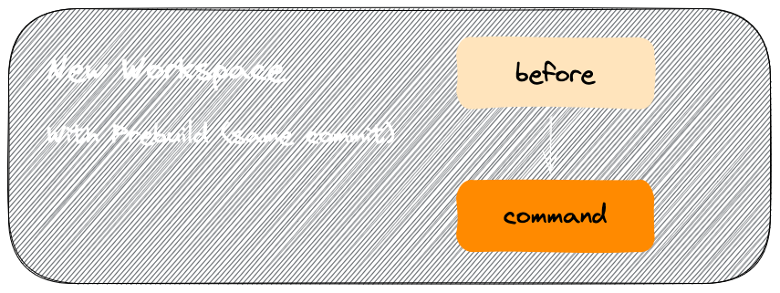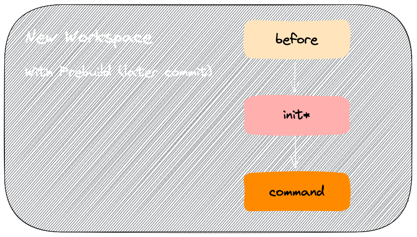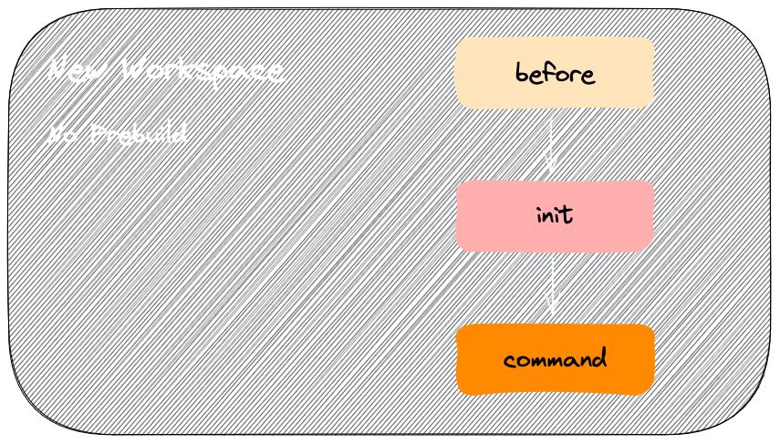 The workspace is started, but Gitpod can’t find a suitable prebuild (yet): all tasksbefore, init and command are executed in that order.