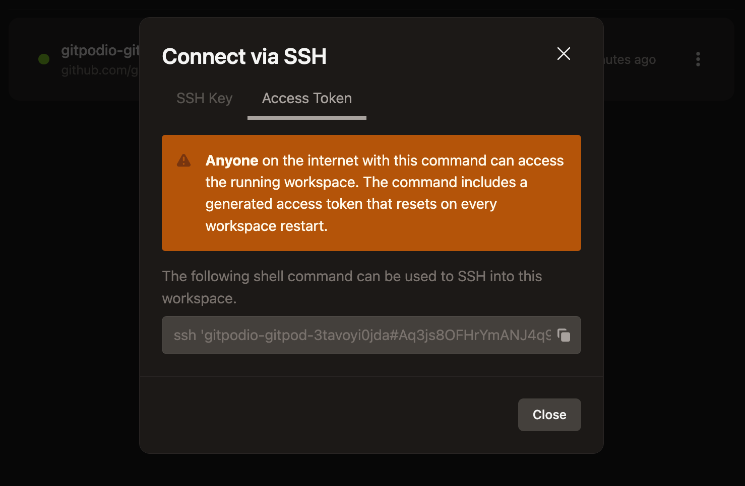 - Access Token - Alternatively, you can access a workspace using the copy/paste SSH command. This approach uses an access token which is reset on every workspace start. This approach is useful for quick SSH access, or when installing an SSH key locally is not possible, such as on some devices.