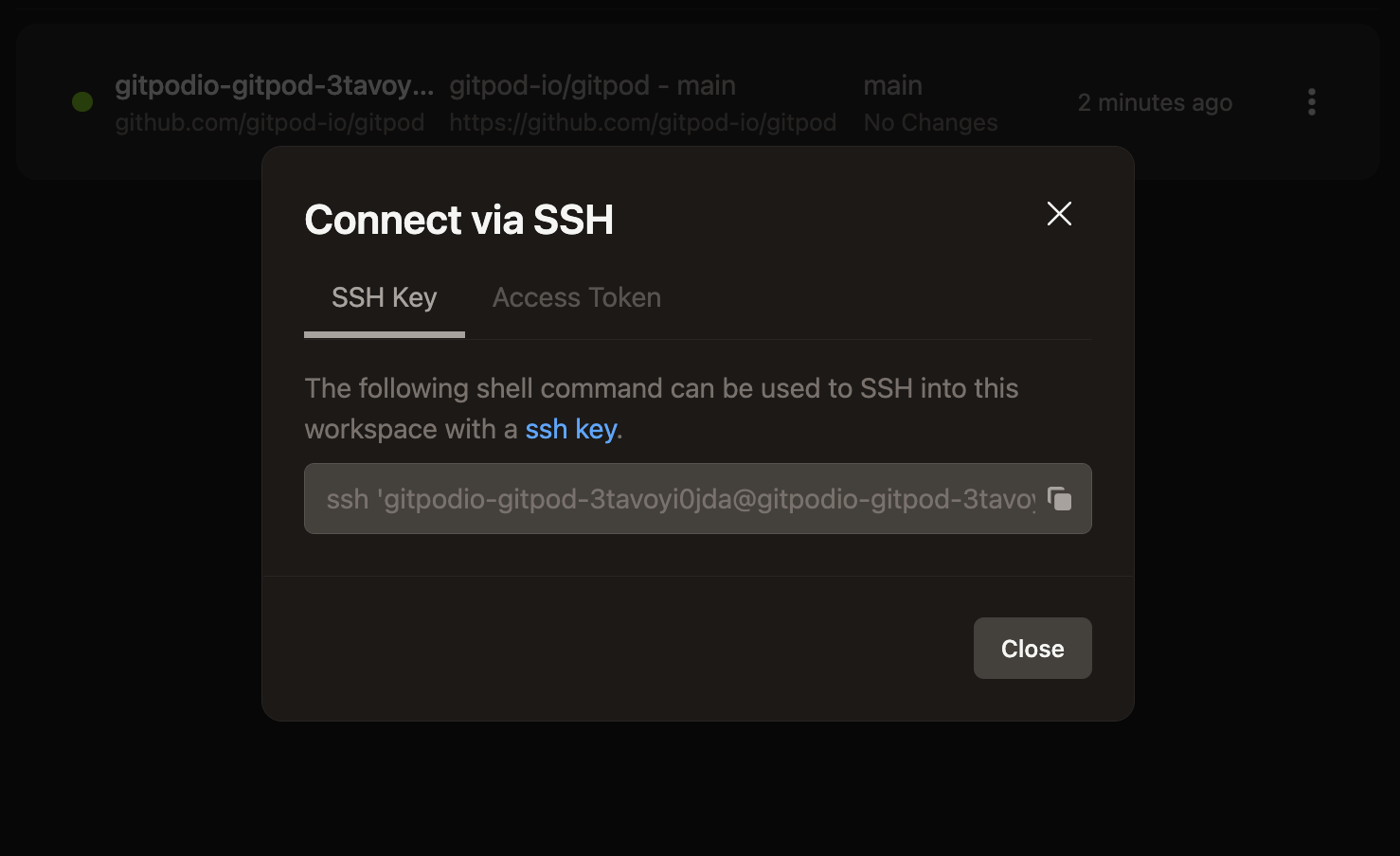 You can currently copy/paste a simple SSH command to get command line access to your workspace from the Gitpod dashboard.- Visit your workspace list in Gitpod
