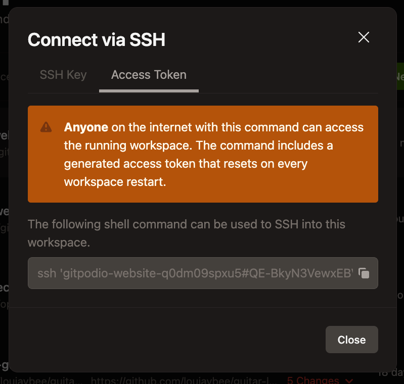 If you cannot upload a public key to Gitpod (for whatever reason) selecting Copy will allow you to proceed to access your Gitpod workspace using the owner token approach. Selecting Copy will copy the necessary password to your clipboard to be pasted in the subsequent password prompt.