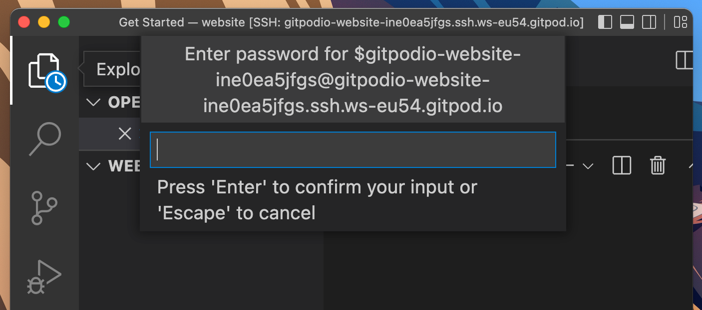 Enter password for workspace@\*.gitpod.io, this prompt is for the owner token of the workspace, not the passphrase associated with your SSH key.