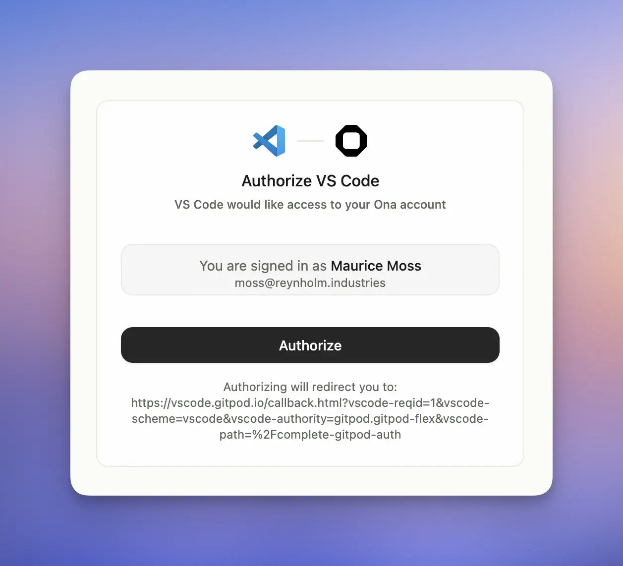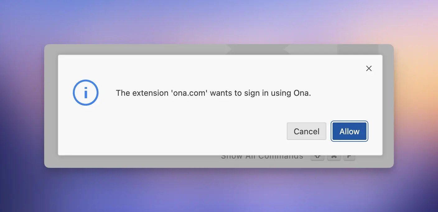 VS Code Browser will then ask you to authenticate with your Ona account: