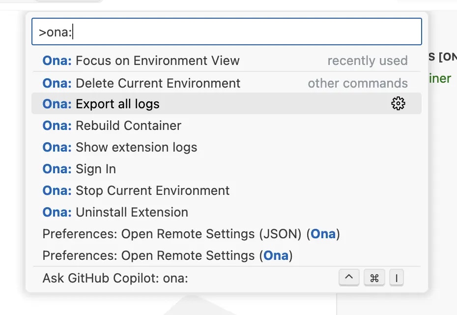 Clicking on the remote indicator in the bottom-left corner of the window also shows a quick menu of Ona commands.