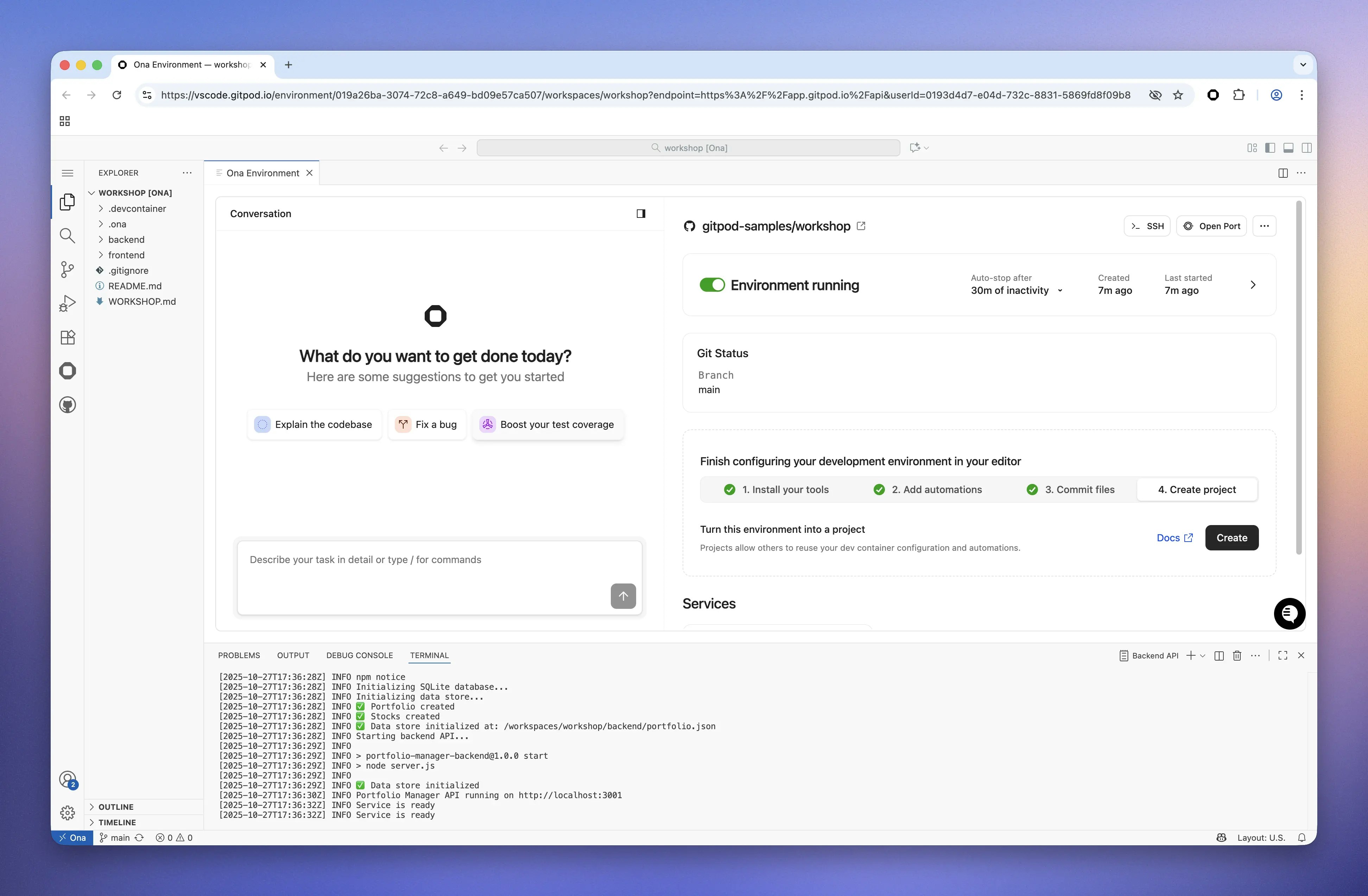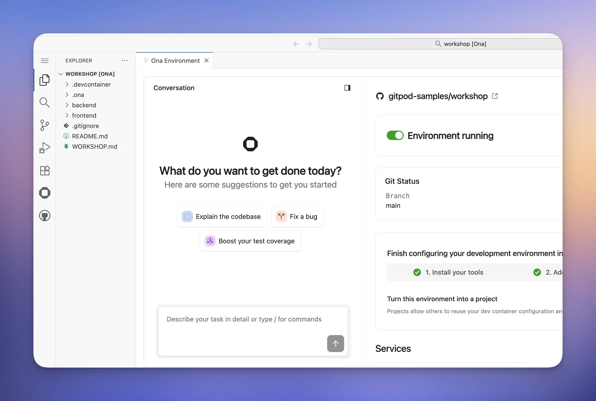 network_mode: "host"on the main service in your Docker Compose file for VS Code Browser to successfully connect to the environment. - VS Code Browser is not supported for local environments created using Ona Desktop.