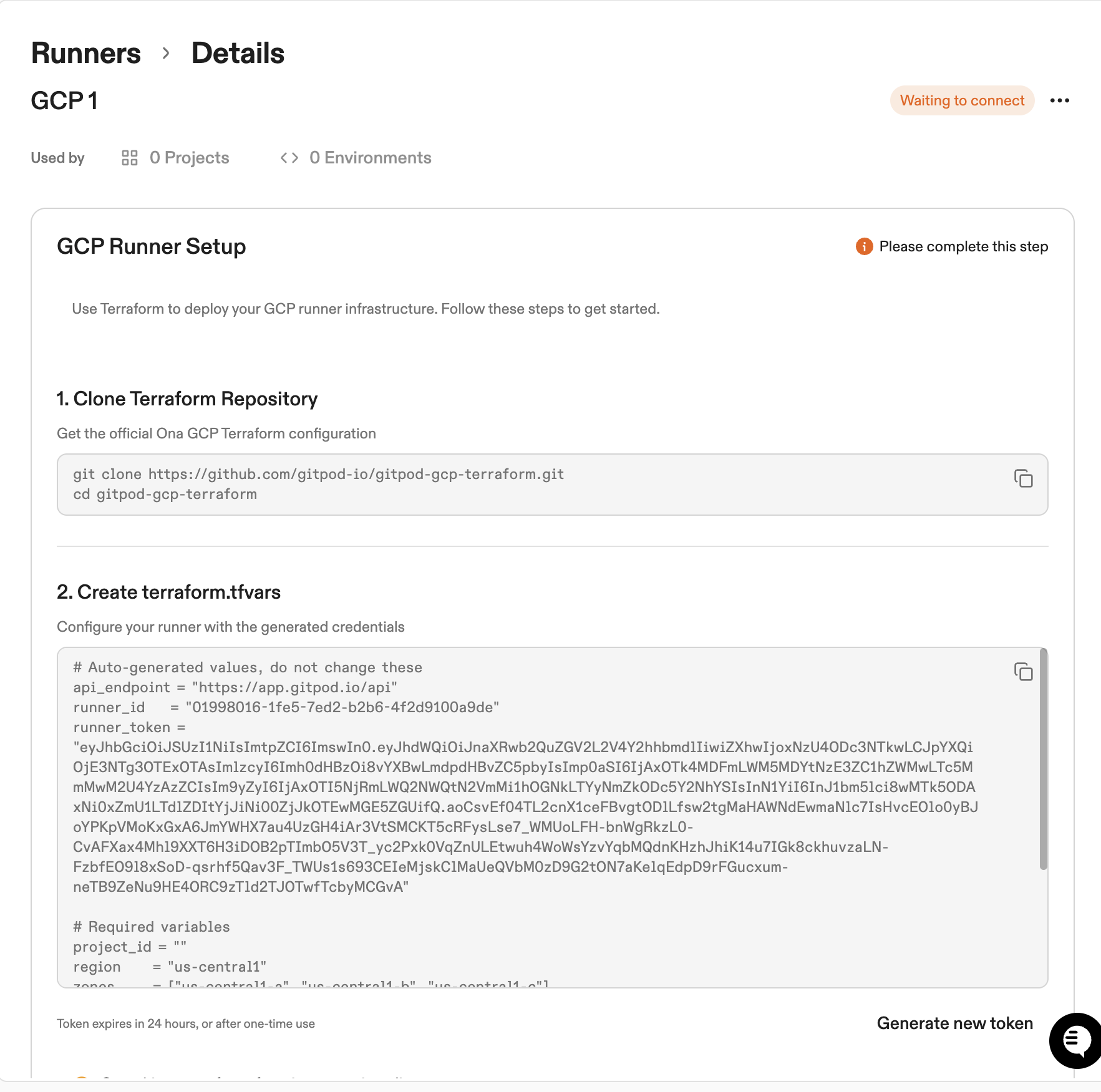 Store the Runner Token securely. You’ll need it for the Terraform configuration and cannot retrieve it again from the dashboard.