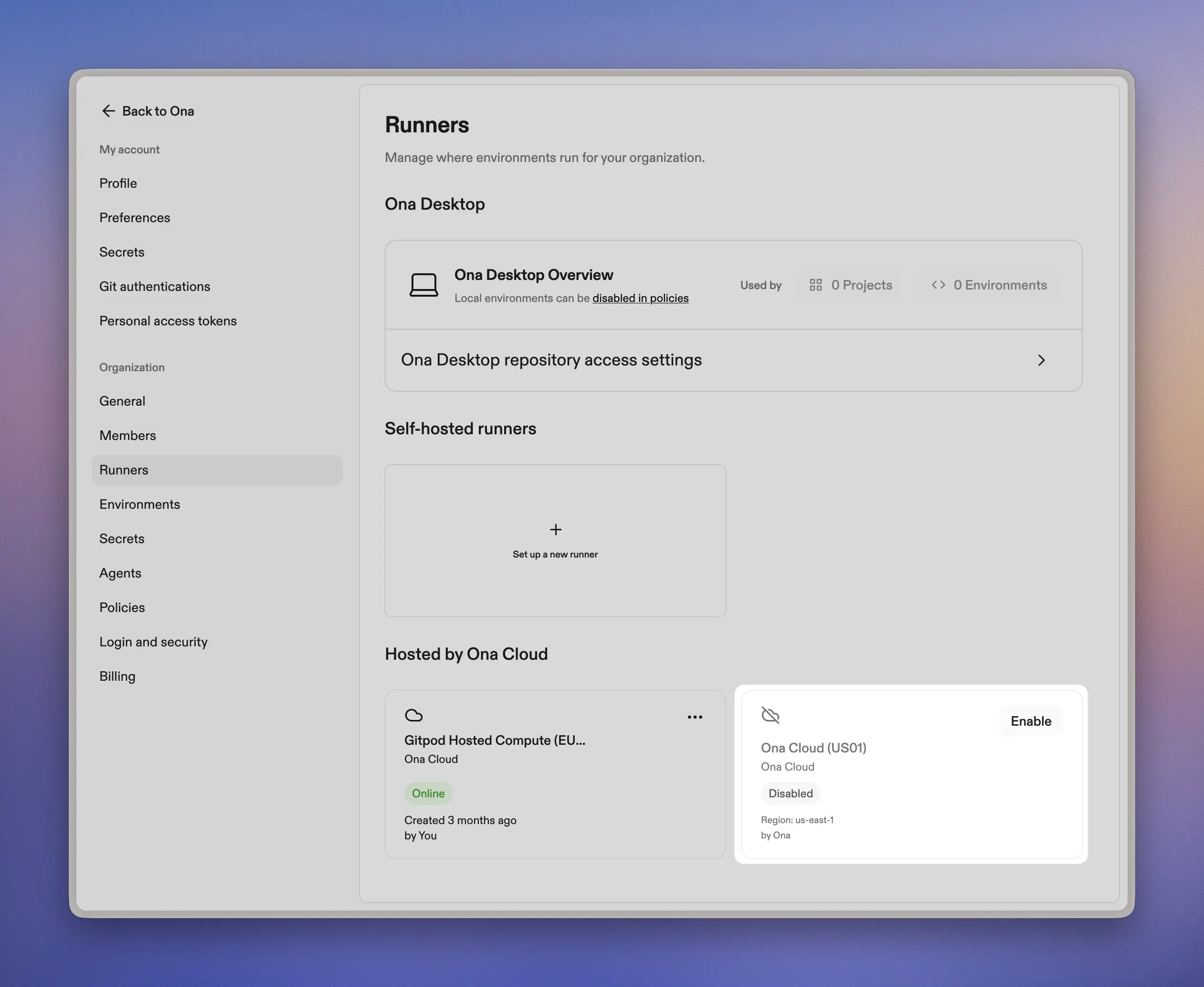 When you create your Ona account in the Free or Core tier, an Ona Cloud runner in a region close-by is automatically added to your organization. More regions can be enabled in the Runner settings.Using Ona Cloud