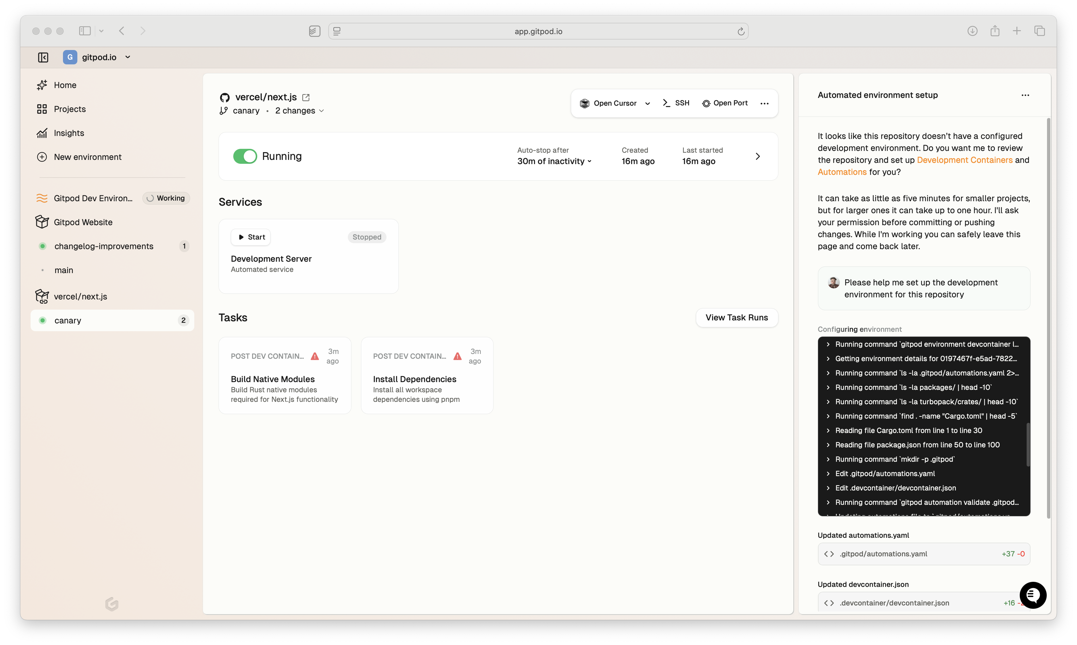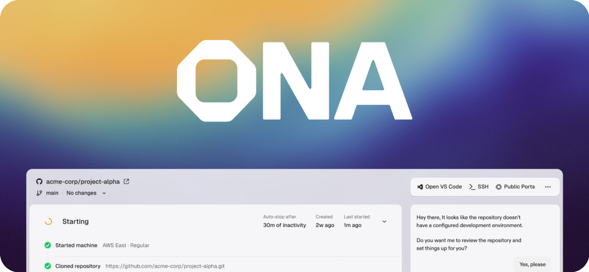 Gitpod’s Enterprise SWE agent, Ona, now automatically analyzes repositories and generates Dev Container and automations configurations, helping you discover the value of Gitpod much faster. |