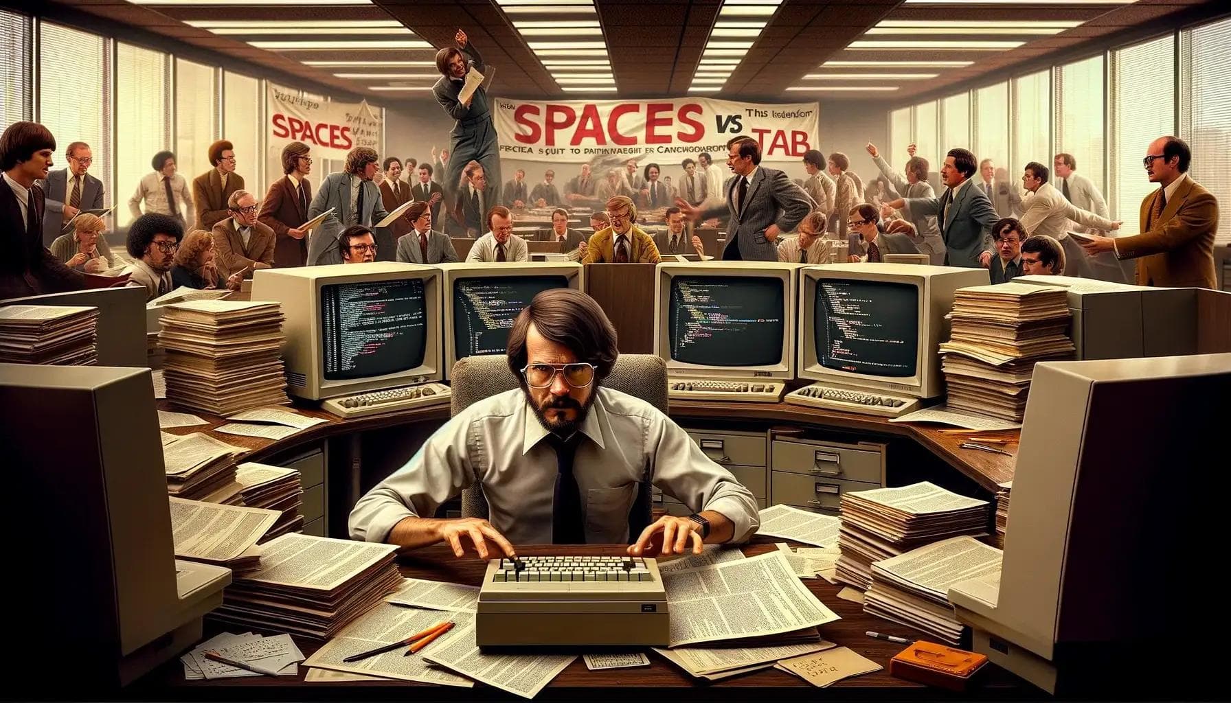 Our satirical journey begins with the legendary tale of Carlo Gustafsson, a name that echoes through the halls of developer history. In the 1970s, this pioneer of productivity sabotage executed a masterstroke, one that would reverberate through the decades: he replaced all tabs with spaces in every changeset. This seemingly innocuous act threw developer tools into disarray, spawning a conflict that would divide developers into two factions – the Spaces and the Tabs.