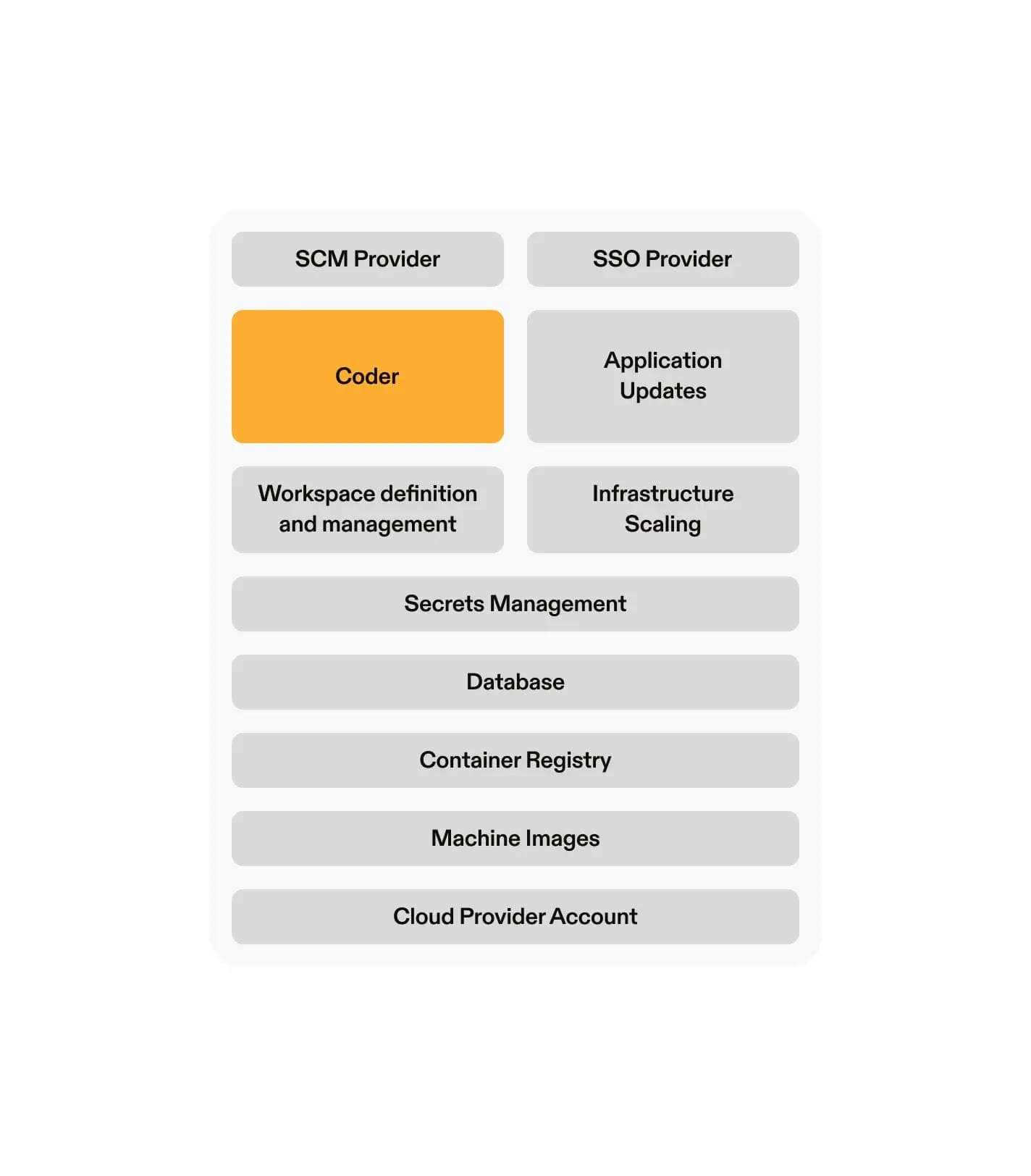 The list above represents the infrastructure choices that Coder provides. It also represents a long-list, not inclusive of everything required in order to maintain a self-managed CDE. Part of that maintenance not represented above is updating the Coder software. Each time Coder pushes an update, you will have to manually make changes to your setup in order to retrofit those changes.