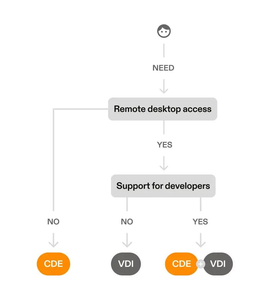 The rule of thumb is simple: your organization should rely exclusively on VDIs only if it does not support any developers. In all other scenarios, your organization should rely on both CDEs and VDIs if they require use of a remote desktop. If they do not require use of a remote desktop, CDEs without VDIs check all the security boxes and provide a better overall experience.