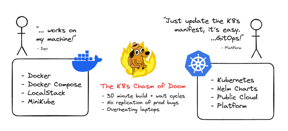 It’s this configuration disparity that gives rise to the “K8s chasm of doom”. We end up with infrastructure defined in one way, often by our platform teams, with our developers using local configurations that are not replicas of production. What begings as simple configurations soon becomes increasingly complex and the risks of the configuration drift can become a risk to our business.