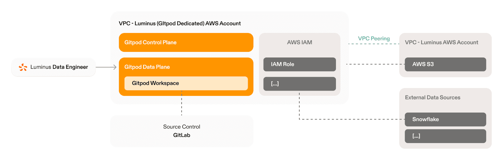 Using the Ona OIDC integration, a Ona workspace is immediately connected to the AWS role that belongs to the purpose of that GitLab repository, allowing data engineerings to immediately access all AWS data and services they have been permissioned to, without having to worry about setting up AWS Access Keys, losing secrets, or issues if devices are stolen or lost. All AWS identity and access management (IAM) rules and policies are then restricted within Luminus’ AWS account and fully controlled by their platform team, allowing them to use any AWS service. Through the OIDC AWS authentication, Luminus can then grant access to other data tools such as Snowflake and resources inside their VPC.