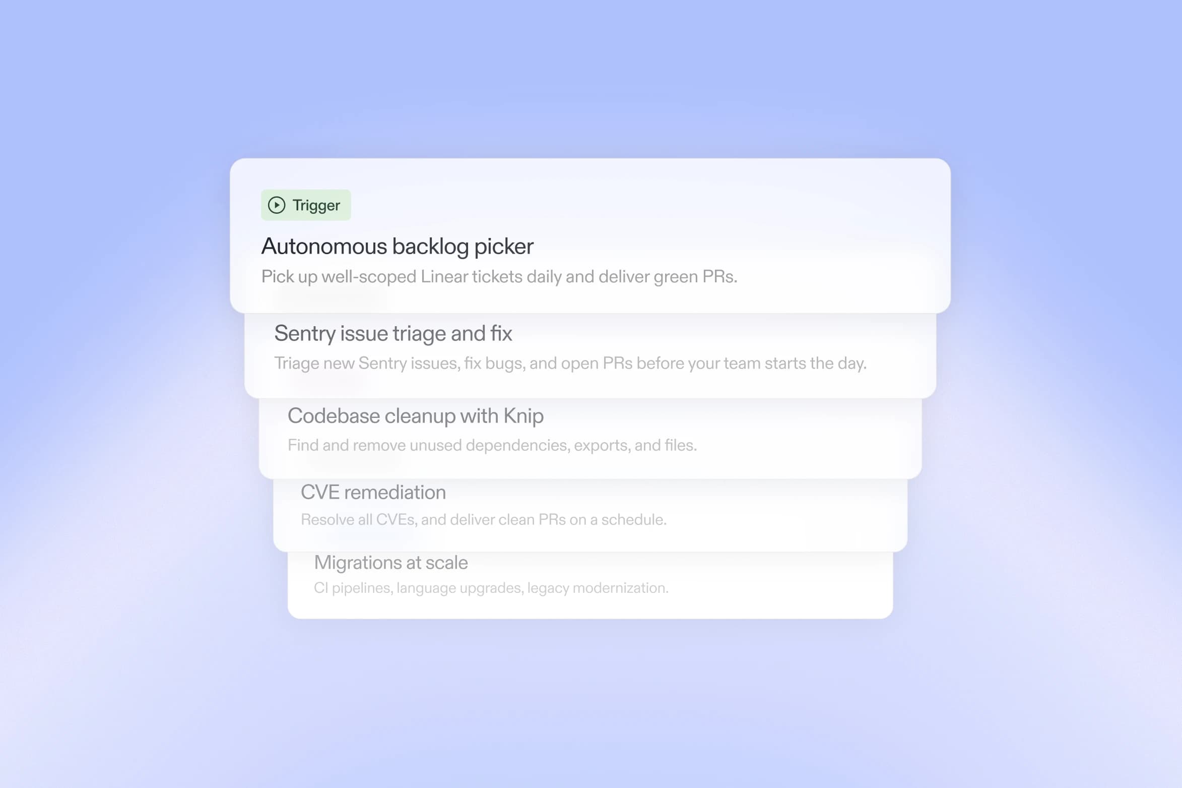 You can start from pre-built templates (CVE remediation, backlog picker, codebase cleanup) or build your own from scratch.