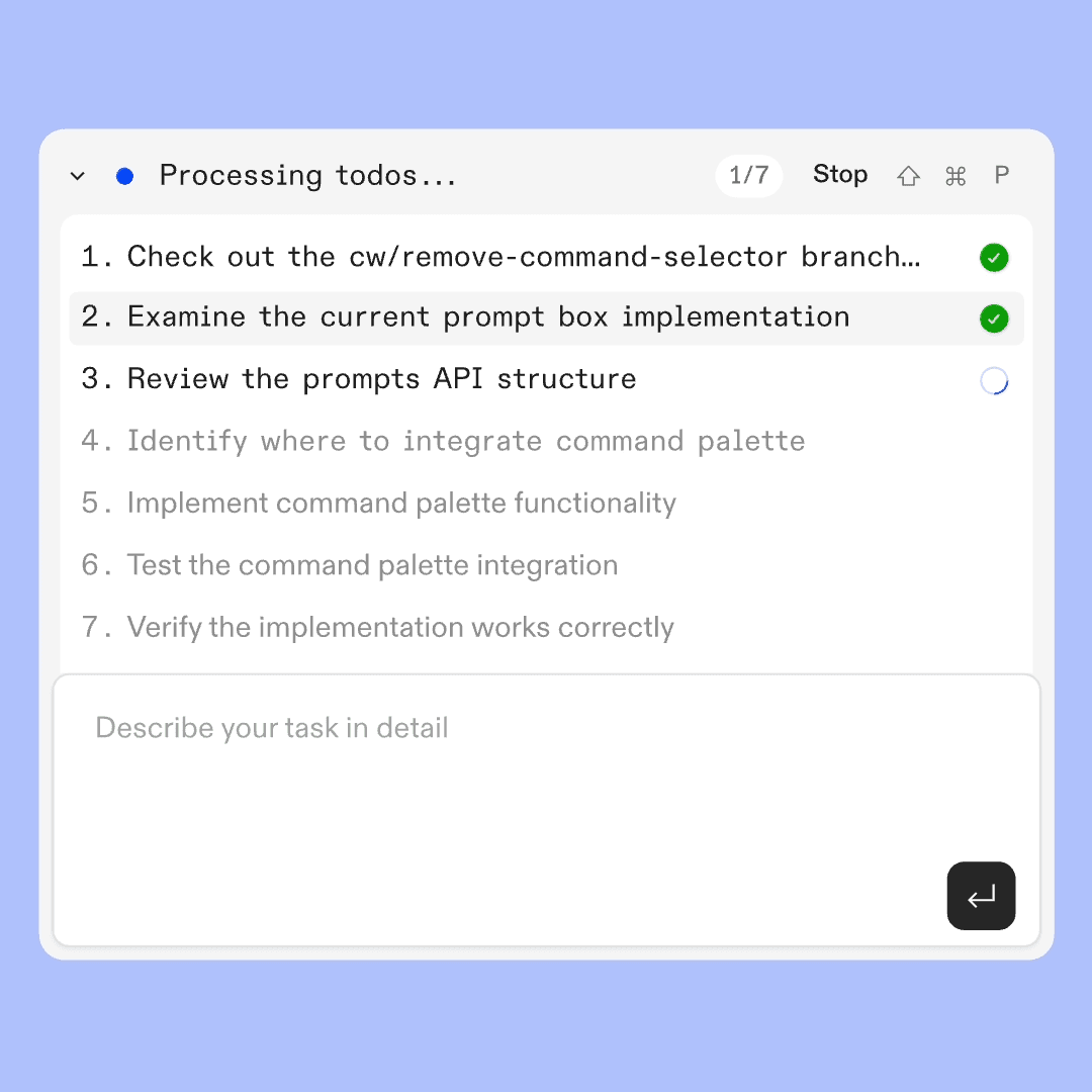 Explore, scope and delegate your tasks to your personal team of professional software engineering agents. Always know what's ready for review, what's in progress, and what's been modified. Keep momentum on any device, starting a task from your phone and taking over on your iPad or laptop.